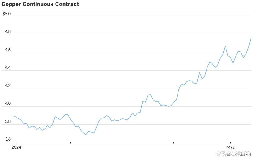 周一,7月交货的铜期货在纽约商品交易所上涨了10美分,或2.2%,收于每磅4.766美元——这是自2022年4月18日以来最活跃合约的最高收盘价。铜价接近历史最高点,2022年3月4日曾创下每磅4.9375美元的历史新高。