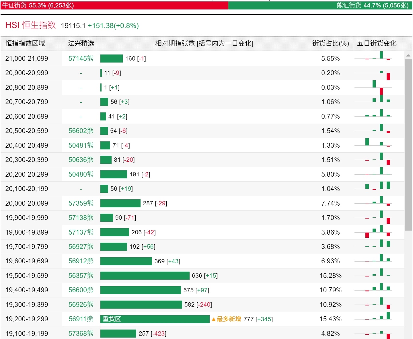 法兴恒指牛熊证街货分布图中的数据显示,熊证街货重货区和最多新增都在19200-19299区间,该区间最新熊证数量为777张,较上一交易日增加345张。