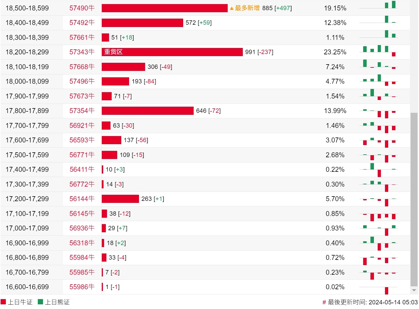 牛证街货重货区在18200-18299区间,该区间最新牛证数量为991张,较上一交易日减少237张;最多新增在18500-18599区间,该区间最新牛证数量为885张,较上一交易日增加497张。