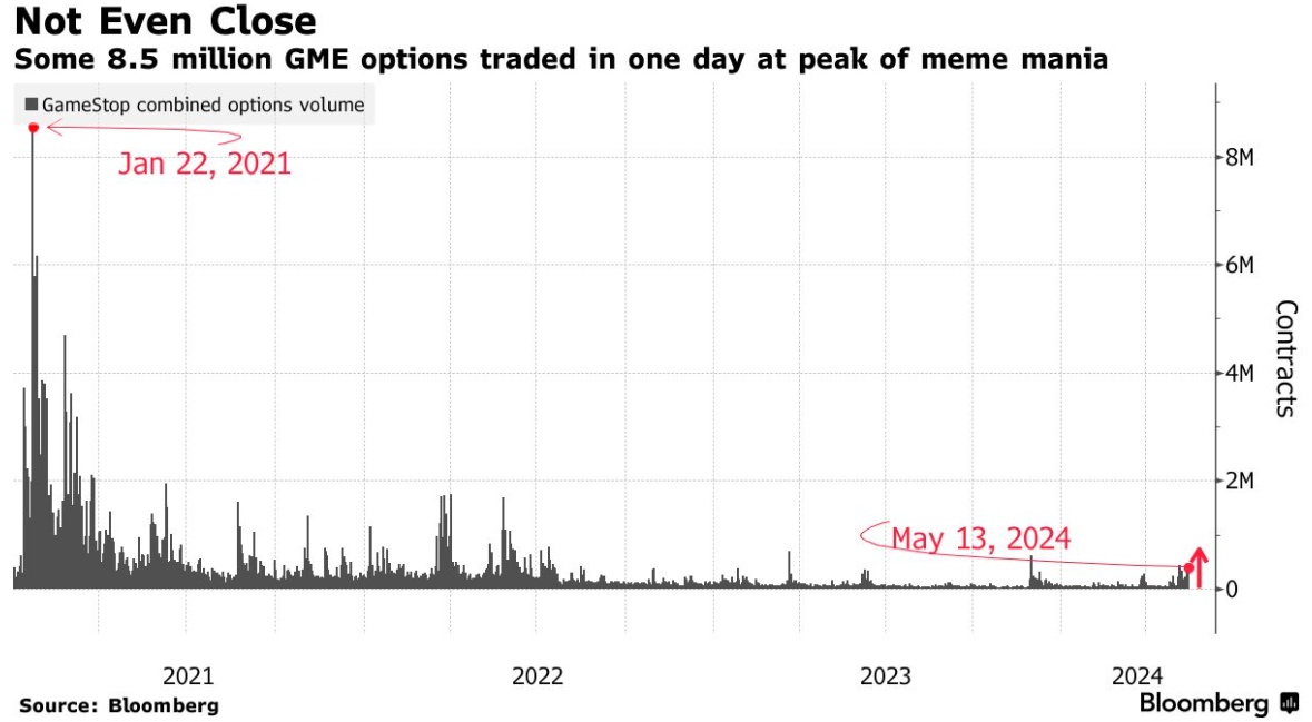 然而,在2021年的模因狂热高峰期,单次交易就有数百万份合约。那一年最活跃的一天是1月22日,交易量达到850万份。
