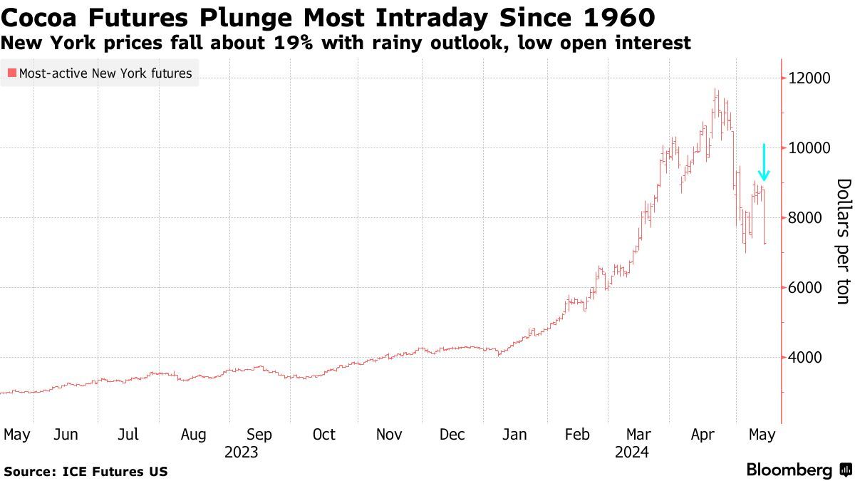 周一,纽约最活跃的可可期货合约跌幅高达19%,这是自1960年以来的最大单日跌幅,伦敦期货跌幅则高达18%。降雨提振了作物前景,与此同时,对可可市场的未平仓头寸处于低位放大了价格波动。