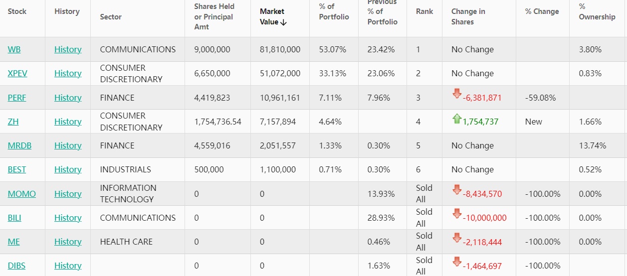 MariaDB(MRDB.US)和百世集团(BEST.US)分别位列第五第六,持有约460万和50万股,持仓数量均没有变化。