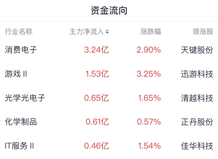 主力资金方面,资金青睐消费电子、游戏等行业;资金出逃等化学制药、电力、证券等行业。