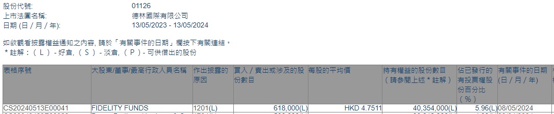 FUNDS减持德林国际(01126)61.8万股,每股作价4.7511港元,总金额约为293.62万港元。减持后最新持股数目为4035.4万股,最新持股比例为5.96%。