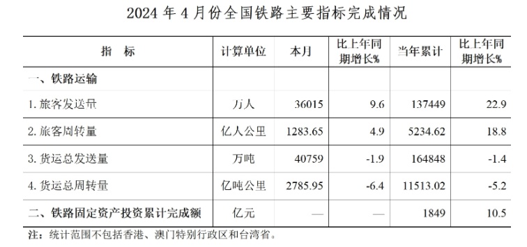 智通财经APP获悉,5月14日,据国家铁路局消息,4月,全国铁路旅客发送量36015万人,同比增长9.6%。铁路固定资产投资累计完成1849亿元,同比增长10.5%。