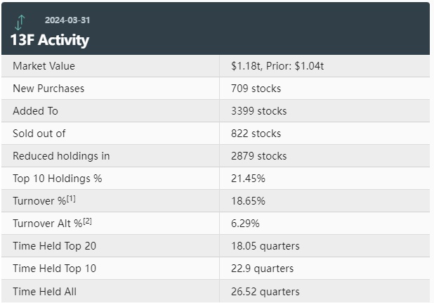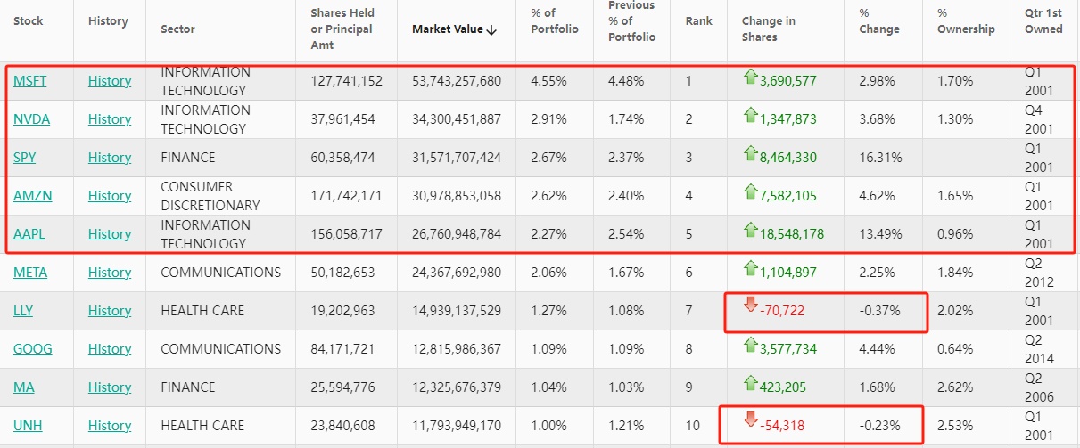 从持仓来看,在前五大重仓股中,微软(MSFT.US)位列第一,持仓约1.28亿股,持仓市值约为573.43亿美元,占投资组合比例为4.55%,较上季度持仓数量增加2.98%。