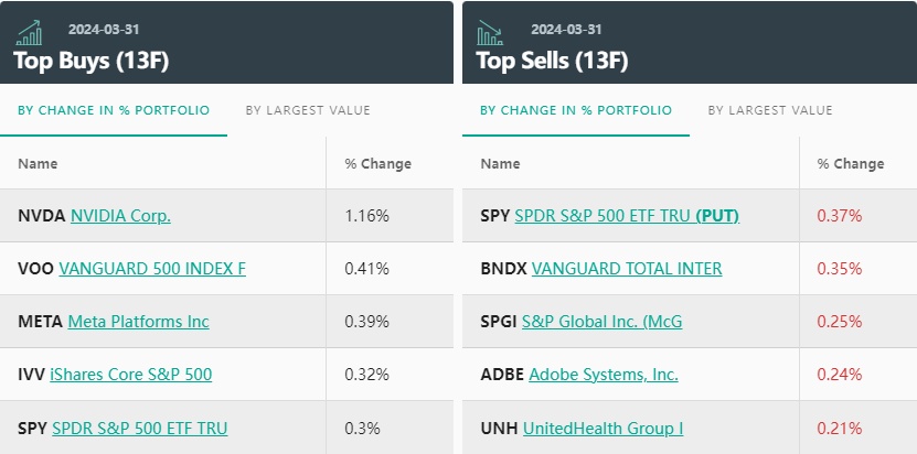 从持仓比例变化来看,前五大买入标的分别是:英伟达(NVDA.US)、Vanguard标普500指数ETF(VOO.US)、Meta(META.US)、iShare标普500指数ETF(IVV.US)、SPDR标普500指数ETF(SPY.US)。