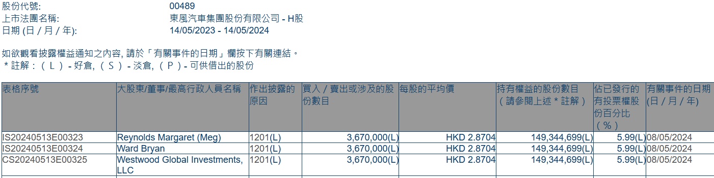 (Meg)减持东风集团股份(00489)367万股,每股作价2.8704港元,总金额约为1053.44万港元。减持后最新持股数目约为1.49亿股,最新持股比例为5.99%。