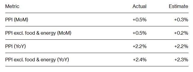智通财经APP获悉,美国4月PPI涨幅高于预期,表明通胀压力仍需要一段时间才能缓解。美国劳工统计局周二公布的数据显示,美国4月PPI同比涨幅为2.2%,符合市场预期,高于3月向下修正后的1.8%:环比涨幅为0.5%,高于市场预期的0.3%和3月向下修正后的-0.1%。此外,美国4月核心PPI同比涨幅为2.4%,符合市场预期,与前值一致;环比涨幅为0.5%,高于市场预期的0.2%。
