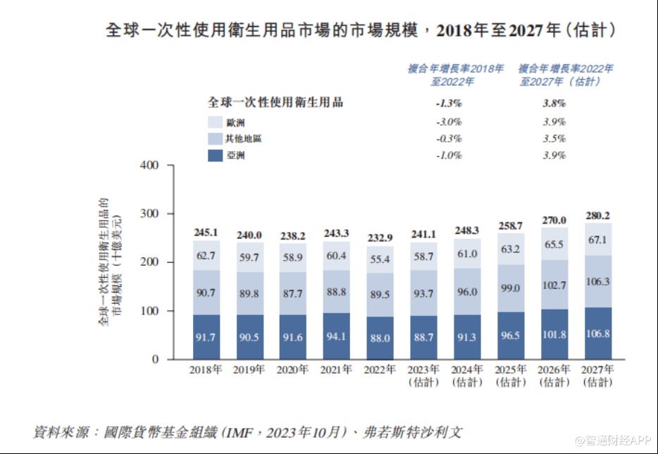 不过,在稳定的营商环境中,舒宝国际未来有望保持稳定的业务增长。根据弗若斯特沙利文报告,全球一次性使用卫生用品市场的市场规模由2018年的约2451亿美元略微下降至2022年的约2,29亿美元,复合年增长率约为-1.3%。预计2027年将达到约2802亿美元,与2022年相比,复合年增长率约为3.8%。