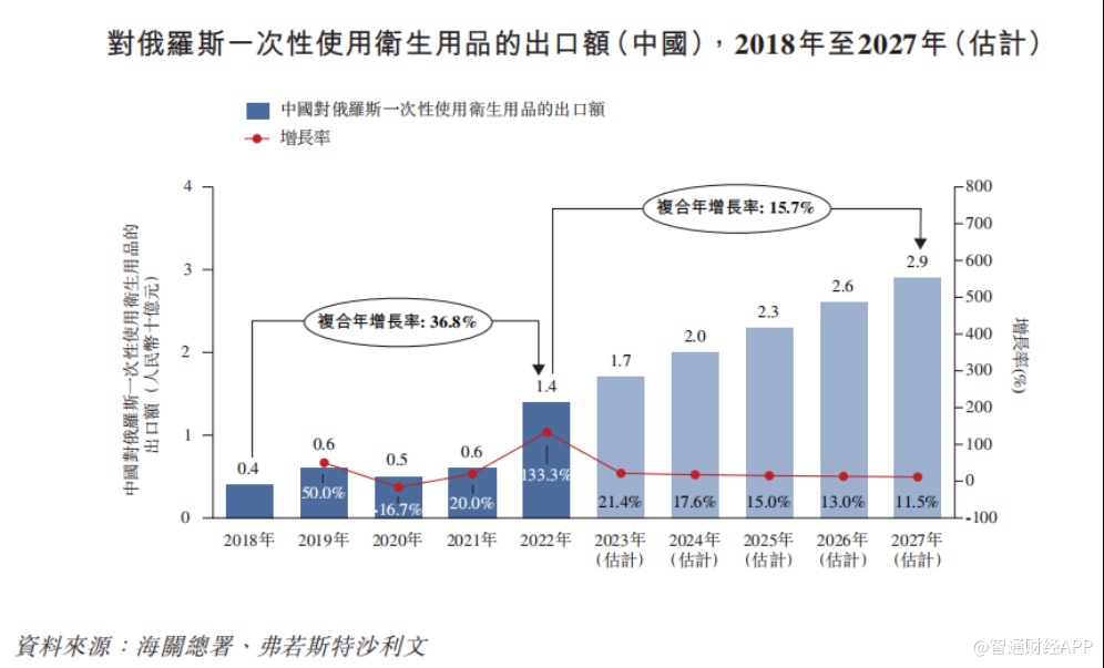 中国对俄罗斯一次性使用卫生用品的出口额出现显著增长,由2018年的约4亿元增长至2022年的约14亿元,复合年增长率约36.8%。预计2027年将达到约29亿元,与2022年相比,复合年增长率约为15.7%。