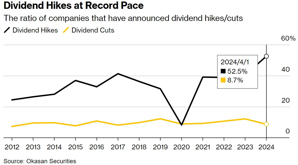 东京证券交易所向企业施压,要求其提高资本效率和估值,因此大量公司增加了对股东的派息。它们还帮助刺激东证指数从 3 月份高点下跌近 10% 后反弹。