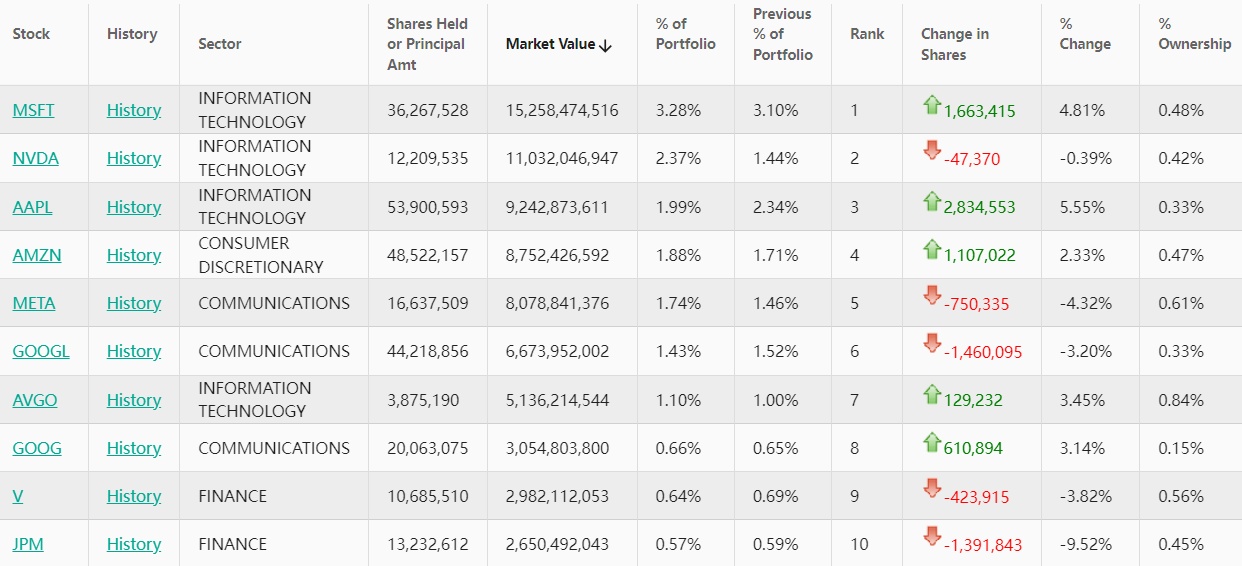 苹果(AAPL.US)位列第三,持仓约5390万股,持仓市值约为92亿美元,占投资组合比例为1.99%,较上季度持仓数量增加5.55%。