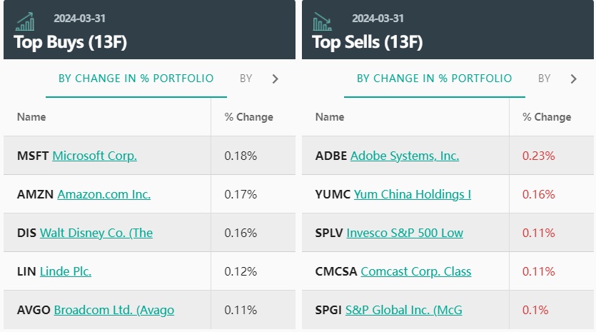 从持仓比例变化来看,景顺第一季度前五大买入标的分别是:微软、亚马逊、迪士尼、全球最大的工业气体供应商Linde(LIN.US)以及博通。其中值得注意的是,景顺第一季度还增持了联合健康(UNH.US)、埃克森美孚(XOM.US)、礼来(LLY.US)等,新增标的包括今年上市、有“小英伟达”之称的Astera Labs(ALAB.US)、博彩公司Flutter Entertainment(FLUT.US)。