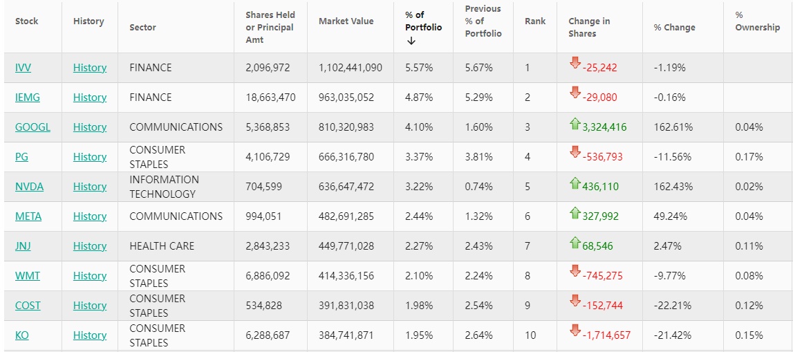 其中,iShares标普500指数ETF(IVV.US)虽然仍位列第一,持仓约209万股,持仓市值约为11.02亿美元,占投资组合比例为5.57%,但较上季度持仓数量减少1.19%。