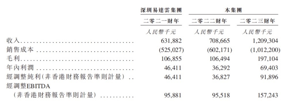 从最新的财务数据表现来看,2021-2023年,易达云分别实现总收入6.32亿、7.09亿、12.09亿元人民币,分别实现净利润4641.1万、3629.2万、6940.3万元人民币。