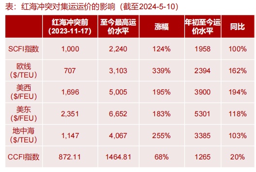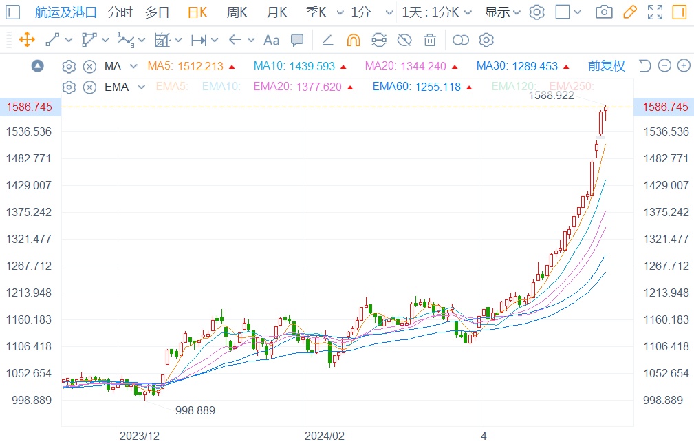 不过,需要注意的是,步入2024年以来,红海绕行问题持续发酵推动航运市场进入上行周期,持续上涨的运价显然也给航运股业绩带来一定的正向作用。