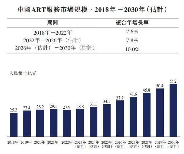 正因如此,在不孕不育人口数上升的背景下,近几年国内ART(辅助生殖技术)市场规模几乎停滞增长。数据显示,2018年国内ART服务市场规模为25.2亿元,到2022年国内ART市场规模仅略微增长至27.9亿元。