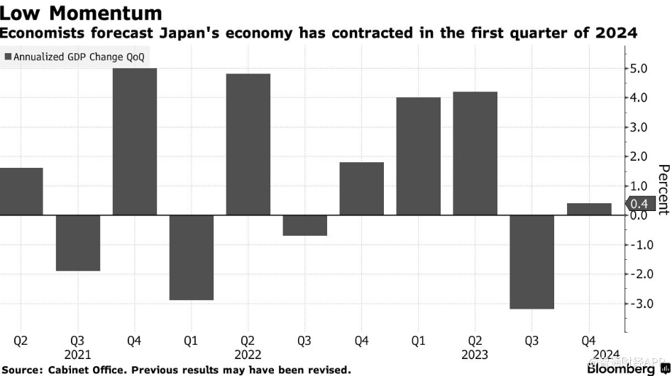 智通财经APP获悉,在日本央行试图为政策正常化设定正确步伐之际,日本经济可能在2024年前三个月出现萎缩,这给经济增长前景蒙上了阴影。日本将于周四公布第一季度国内生产总值(GDP)数据。接受Bloomberg调查的经济学家预计,日本第一季度GDP折合成年率将萎缩1.2%。初步数据预计将显示消费者和企业支出下降,而净出口一年来首次拖累经济增长。