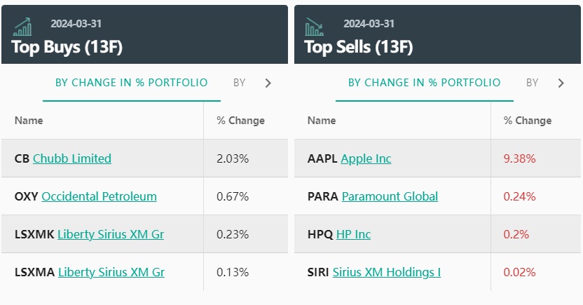 从持仓比例变化来看,前四大买入标的分别是:安达保险、西方石油、Liberty SiriusXM Series C(LSXMK.US)、Liberty SiriusXM Series A(LSXMA.US)。