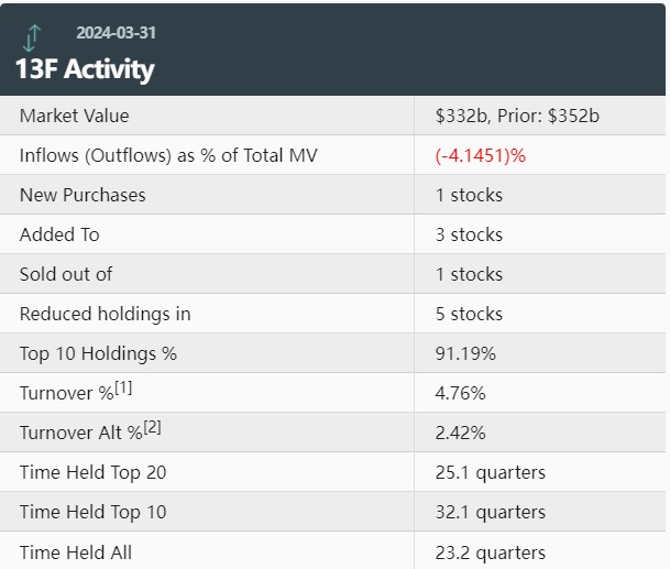 智通财经APP获悉,根据美国证券交易委员会(SEC)披露,“股神”巴菲特旗下的伯克希尔哈撒韦(BRK.A.US,BRK.B.US)递交了截至2024年3月31日的第一季度持仓报告(13F)。
