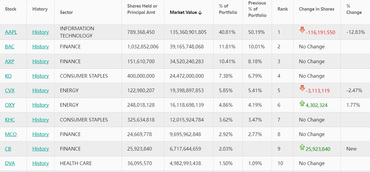 在前五大重仓股中,苹果(AAPL.US)仍然位列第一,持仓约7.89亿股,持仓市值约1354亿美元,占投资组合比例为40.81%,持仓数量较上季度大幅下降12.83%。