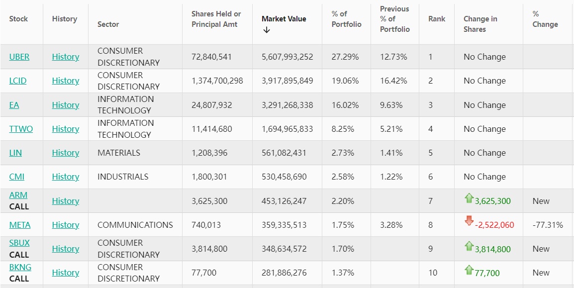 在沙特主权财富基金PIF第一季度的前十大重仓标的之中,大部分仓位相比于上一季度无任何变动,不过PIF在第一季度大举新买入芯片设计领域领导者ARM(ARM.US)看涨期权,且持仓已位列第七大重仓标的。Facebook与Instagram母公司Meta(META.US)则在第一季度遭PIF大幅减持77%,但是仍位列第八大重仓标的,此外前十大重仓中PIF还新建仓星巴克(SBUX.US)以及Booking(BKNG.US)看涨期权。值得注意的是,PIF这份最新13F报告显示出这家主权财富基金大举追逐全球投资者们围绕AI的史无前例投资热潮,PIF在一季度不仅新建仓ARM,还新建仓AMD、英伟达以及微软等AI领域领导者们的股票看涨期权。