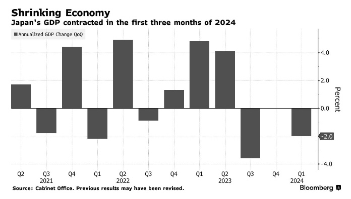 日本内阁府周四公布的初步统计结果显示,截至3月的三个月内,国内生产总值(GDP)按年率计算下降2.0%,不及经济学家预期的萎缩1.2%。私人消费和资本支出双双回落,并且,净出口也拖累了经济增长。2023年最后一个季度的数据被修正为持平,而此前的数据为增长0.4%。