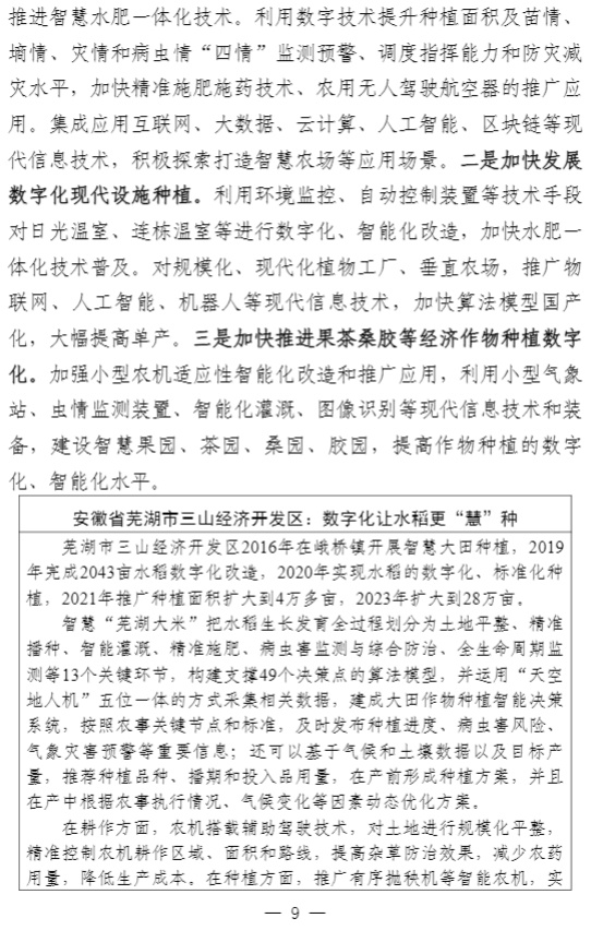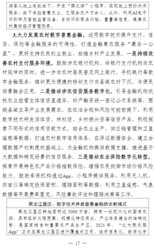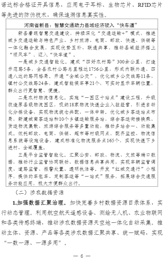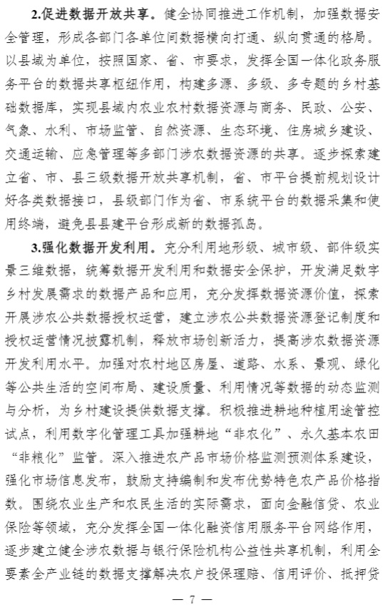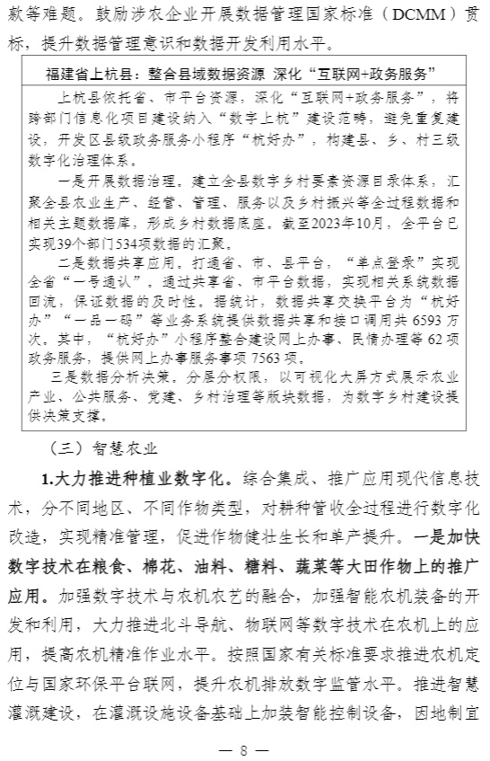 智通财经APP获悉,近日,中央网信办秘书局、农业农村部办公厅、国家发展改革委办公厅、工业和信息化部办公厅、市场监管总局办公厅、国家数据局综合司联合印发《数字乡村建设指南2.0》。中央网信办、农业农村部有关负责同志表示,《指南2.0》主要对《指南1.0》进行了5个方面的优化完善。一是将原“公共支撑平台”内容纳入“涉农数据资源”,强调更好发挥数据要素价值。二是将“智慧农业”从“乡村数字经济”中单独成章,更好指导各地智慧农业发展。三是将“建设发展模式”和“建设过程管理”整合优化为“建设方法”,进一步突出指南的可操作性。四是细化保障措施,补充市级层面工作任务,明确省、市、县三级任务分工。五是完善典型案例,结合近几年创新实践成果,对案例进行了优化完善,提升指南的可参考性。