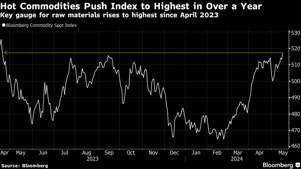 智通财经APP获悉,原材料价格的上升给各大央行抑制通胀的努力带来了阻碍。彭博商品现货指数(Bloomberg Commodity Spot Index)周三小幅上升,至2023年4月以来的最高水平。