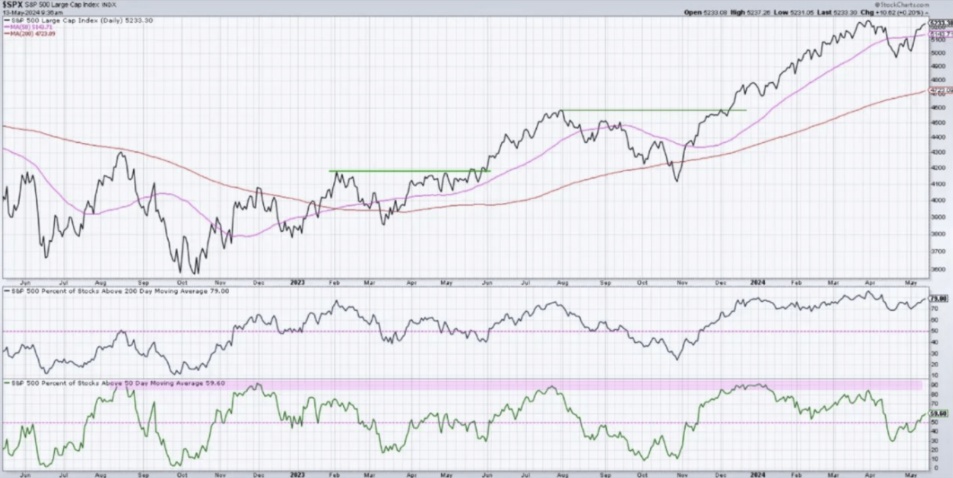 Keller对标普500指数的未来走势进行了深入分析,并提出了积极的市场预期。Keller特别关注了该指数突破50日移动平均线后市场广度的指标,并指出这一突破具有重要的市场意义。
