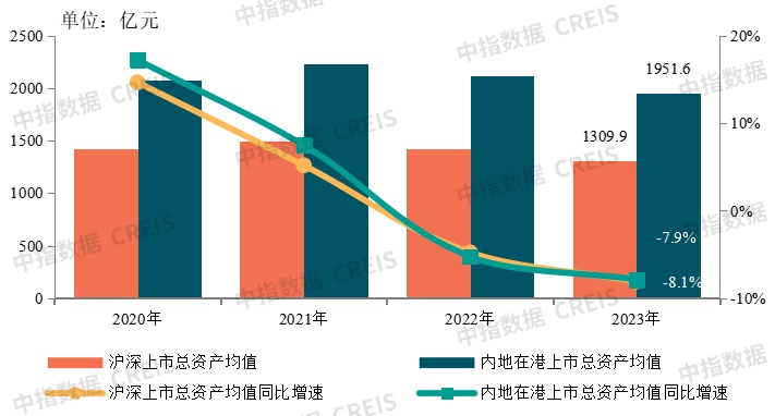 2023年,房地产上市公司总资产规模连续两年负增长,降幅扩大。其中,沪深上市房地产公司总资产均值为1309.9亿元,较上年下降8.1%,降幅较上年扩大3.3个百分点。内地在港上市房地产公司总资产均值为1951.6亿元,较上年下降7.9%,降幅较上年扩大2.6个百分点。沪深及内地在港上市房地产公司总资产连续两年负增长,行业持续缩表。行业缩表主要源自民营和混合所有制房企缩表,央企资产规模与上年基本持平,地方国企资产规模小幅增长。