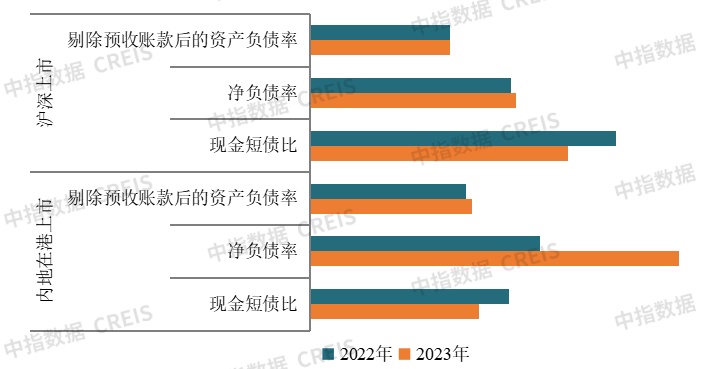 2023年,行业继续在调整期运行,沪深上市公司及内地在港上市公司负债率均有所上升。沪深及内地在港上市房地产公司净负债率均值为91.2%、163.1%。短期偿债能力持续下降,沪深及内地在港上市房地产公司现金短债比均值分别为1.14、0.75。