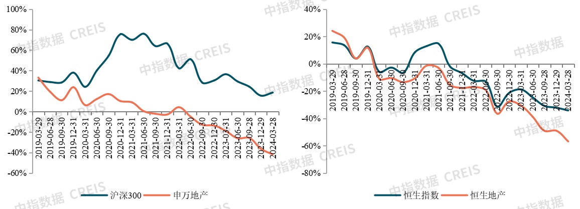 2019-2024年一季度房地产板块与大盘涨跌幅度变化情况