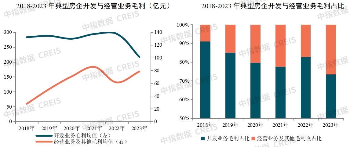 房企构建新发展模式初现成效,经营性业务业绩增长快于开发业务,重要性日益凸显。从业务规模看,典型房企经营性业务营收在2018年至2023年之间年复合增长率达到21.0%,增速比开发业务高出6.4个百分点。同时,较高的增速也使经营业务在企业整体营收中的占比呈现上升态势。从利润来看,开发业务毛利下滑,经营业务利润贡献度凸显。2018年至2023年,典型房企毛利中来自经营业务的占比从8.9%增长到26.5%。