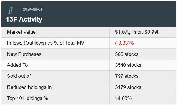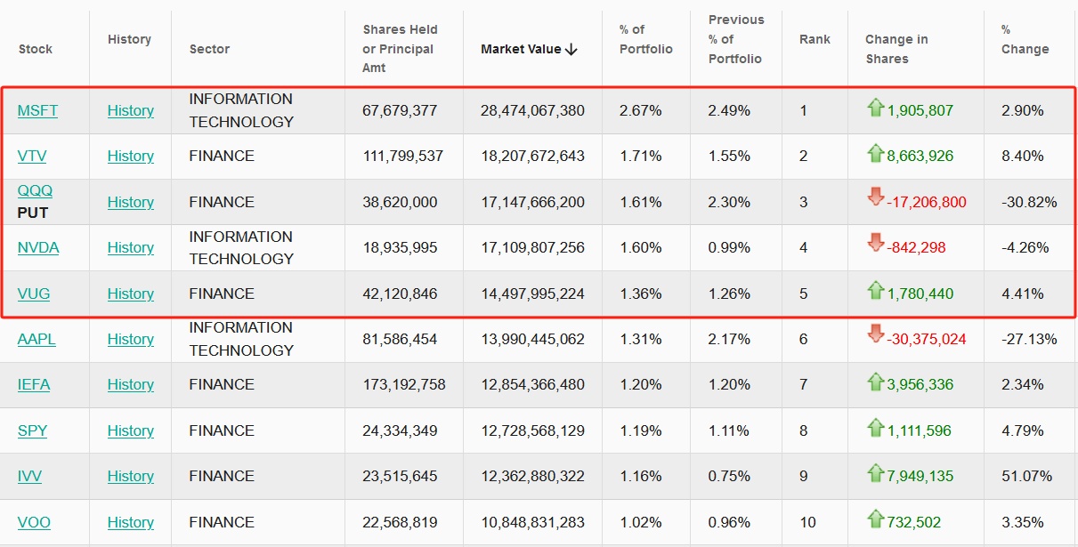 在前五大重仓股中,微软(MSFT.US)位列第一,持仓约6768万股,持仓市值约为285亿美元,占投资组合比例为2.67%,较上季度的持仓数量增加2.90%。
