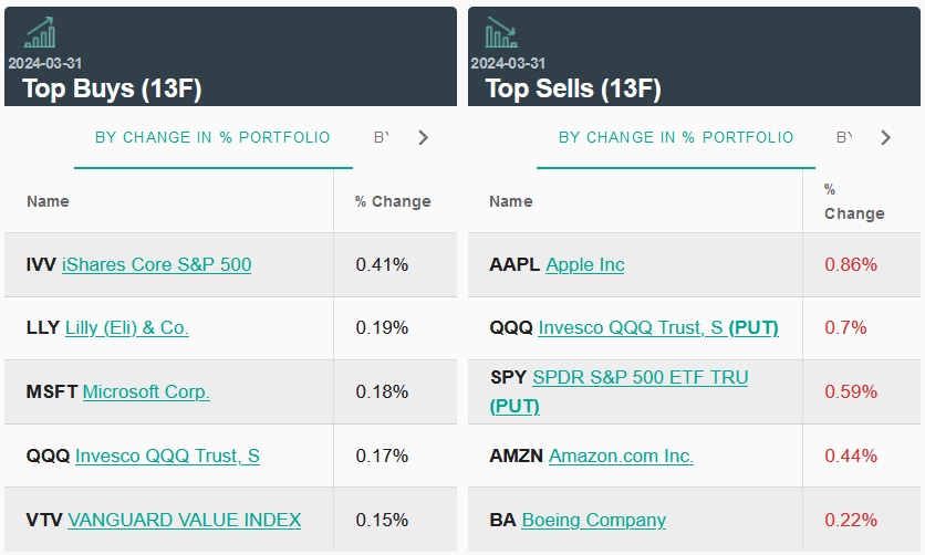 从持仓比例变化来看,前五大买入标的分别是:iShares标普500指数ETF、礼来(LLY.US)、微软、纳斯达克100指数ETF(QQQ.US)、Vanguard价值股ETF。