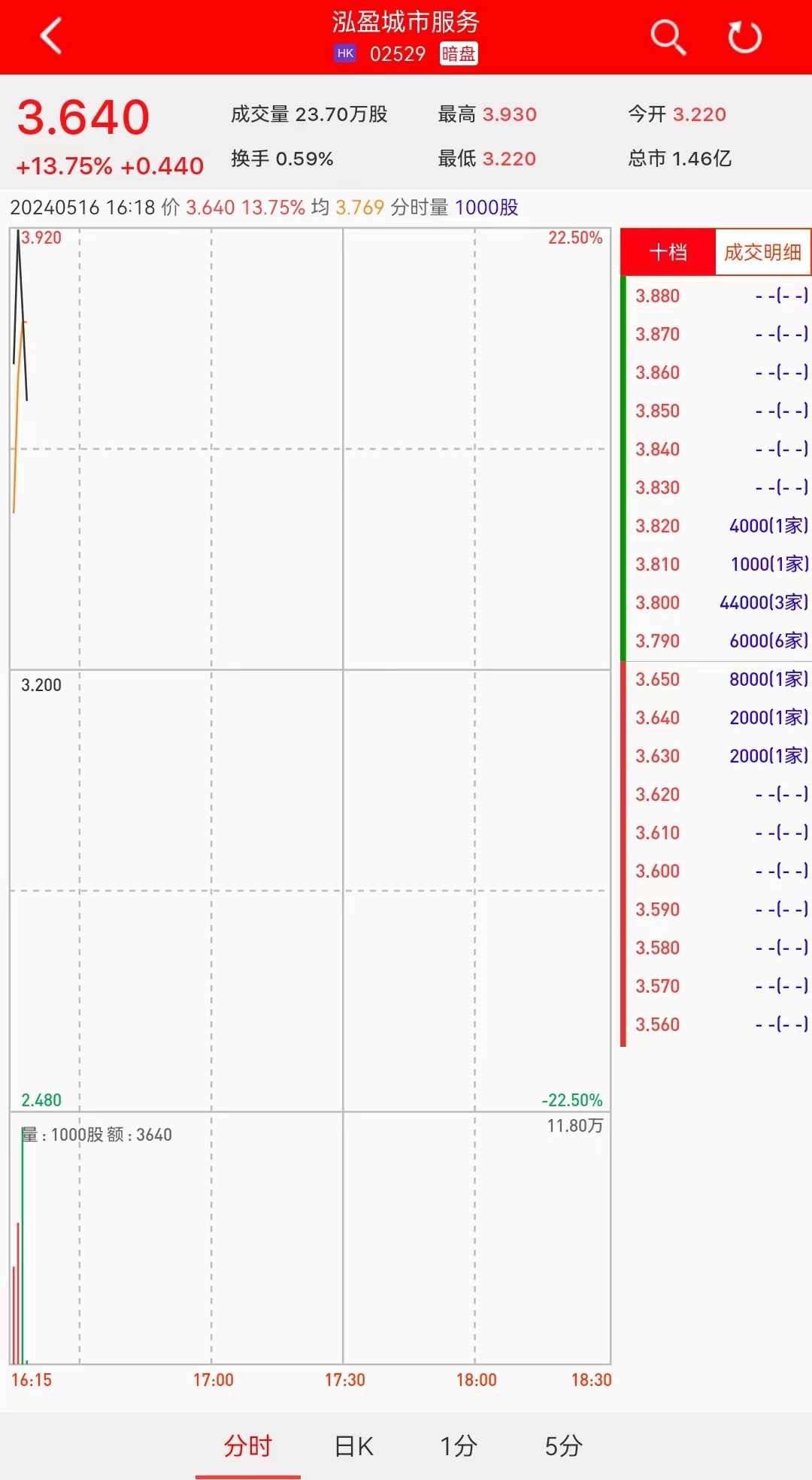 智通财经APP获悉,泓盈城市服务(02529)将于5月17日(周五)在香港挂牌。截至发稿,利弗莫尔证券暗盘交易显示报价3.64港元,较招股价3.20港元上涨13.57%。每手1000股,不计手续费,每手赚440港元。