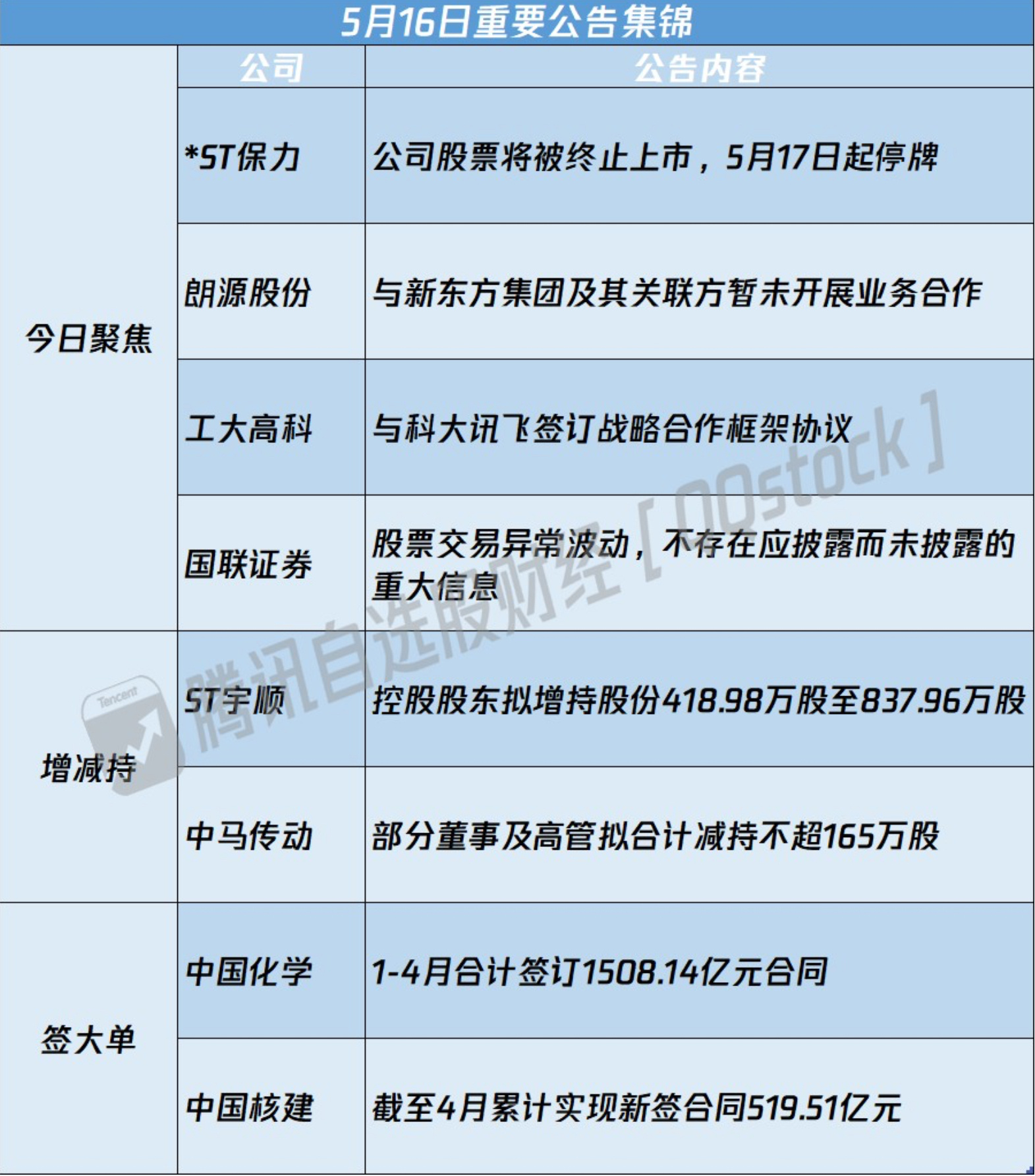 *ST保力公告,公司股票收盘价连续二十个交易日低于1元,已触及交易类强制退市情形,公司股票将被深圳证券交易所终止上市交易。公司股票将自5月17日(周五)开市起停牌。