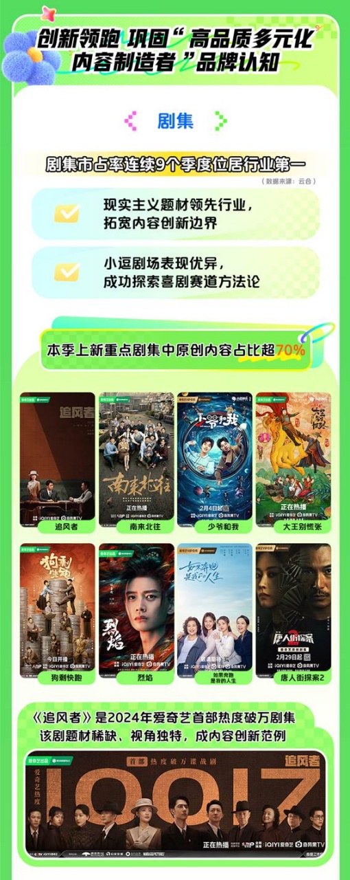 《追风者》凭借民国谍战+金融+悬疑的稀缺题材和独特视角,成功实现爱奇艺热度值破万,也成为内容创新的范例。春节期间播出的《南来北往》创下央视电视剧频道收视率新纪录,云合数据显示市占率最高超过27%。爱奇艺聚焦喜剧赛道推出的小逗剧场在第一季度上线了《少爷和我》《大王别慌张》《狗剩快跑》,其中《狗剩快跑》在热度值、收入和投资回报上均创该剧场新高。进入第二季度,携6部作品回归的迷雾剧场已上线首部剧集《不可告人》,待播作品还有《看不见影子的少年》《交错的场景》。其他剧集方面,已播出的《城中之城》《哈尔滨一九四四》《我的阿勒泰》反响热烈,《城中之城》成为今年央视综合频道黄金时段收视率最高的内容。后续《狐妖小红娘月红篇》《颜心记》《小夫妻》等也备受期待。2024年,新推出的大家剧场和微尘剧场瞄准现实主义题材赛道。刚刚播出的微尘剧场首部作品《我的阿勒泰》以散文集为蓝本,在影视改编中融入轻喜剧元素,制作上首次应用爱奇艺自研的QClip制作上云系统提升了效率,并通过爱奇艺帧绮映画MAX认证标准使该剧达到影院级视听体验,这些因素令该剧成为制作新标杆。目前,该剧在国内外好评如潮,不仅以8.8分拿下今年豆瓣国产剧集最高评分,也成为首部在央视综合频道黄金时段播出的八集迷你剧,同时还是首部入围戛纳电视剧节主竞赛单元的华语剧集。