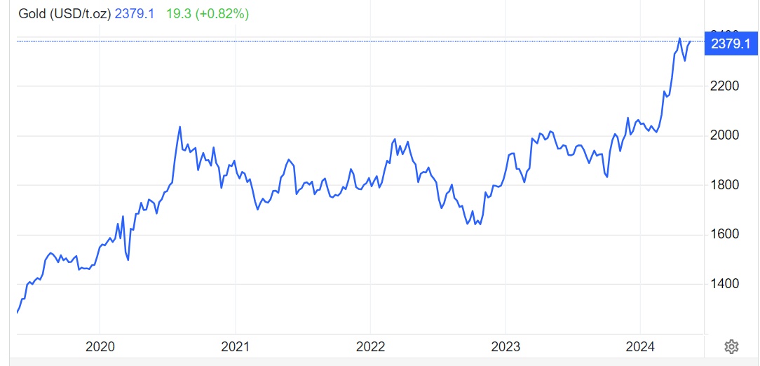 最新数据显示,现货黄金价格最终在周四小幅回落后以轻微跌势收尾,金价小幅回落至每盎司2382美元左右,在上个交易日则收于4月19日以来的最高水平后,4月19日正是黄金创下超2400美元这一历史新高的时间点。近几周黄金价格可谓非常强势,在今年剩余时间有可能屡创新高。