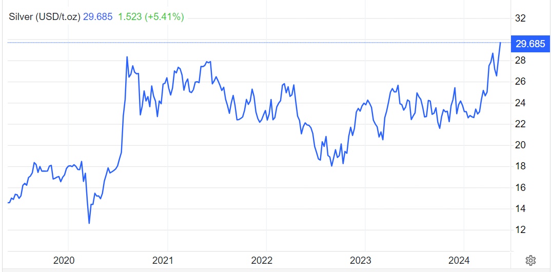 与此同时,现货白银价格在周四也有所调整,最终小幅下跌0.5%,至每盎司29.5美元左右。这种贵金属有时被称为黄金的“穷亲戚”,在金价处于高位时投资者们往往将资金涌入白银,期待价格低得多的白银能够不断蹭上黄金热度,周三白银曾短暂触及29.73美元,创下自2021年2月以来的最高盘中水平。