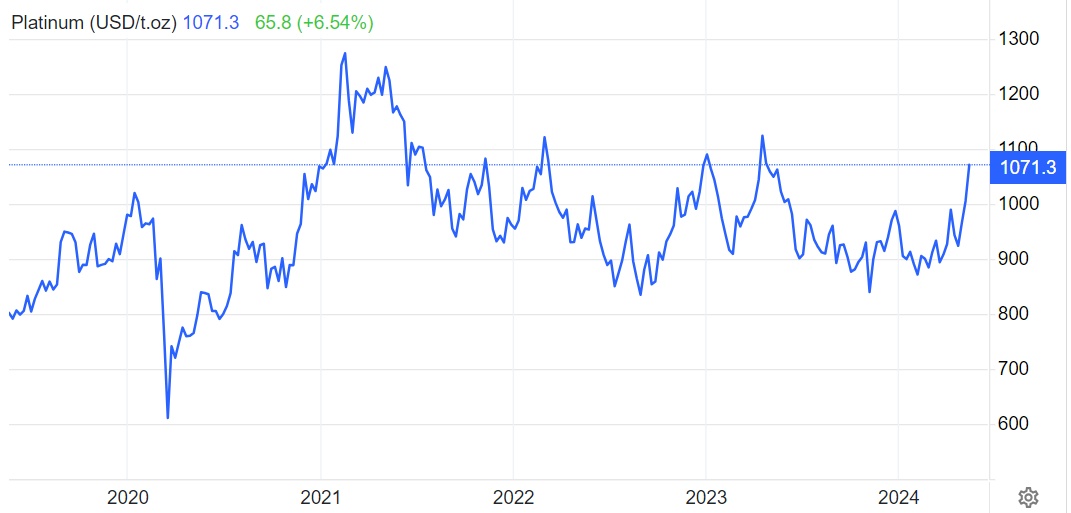 周四,7 月交割的白金价格上涨 0.7%,至每盎司 1077 美元,延续了周三收盘时的涨幅,在周三铂金收涨近3%,创下一年来的最高价位。世界铂金投资理事会(WPIC)表示,由于南非和俄罗斯矿山供应规模减少,预计今年全球铂金缺口将比此前预期的更大。此外,铂金在汽车催化转换器和绿色氢技术中的广泛应用将继续推动需求增长。