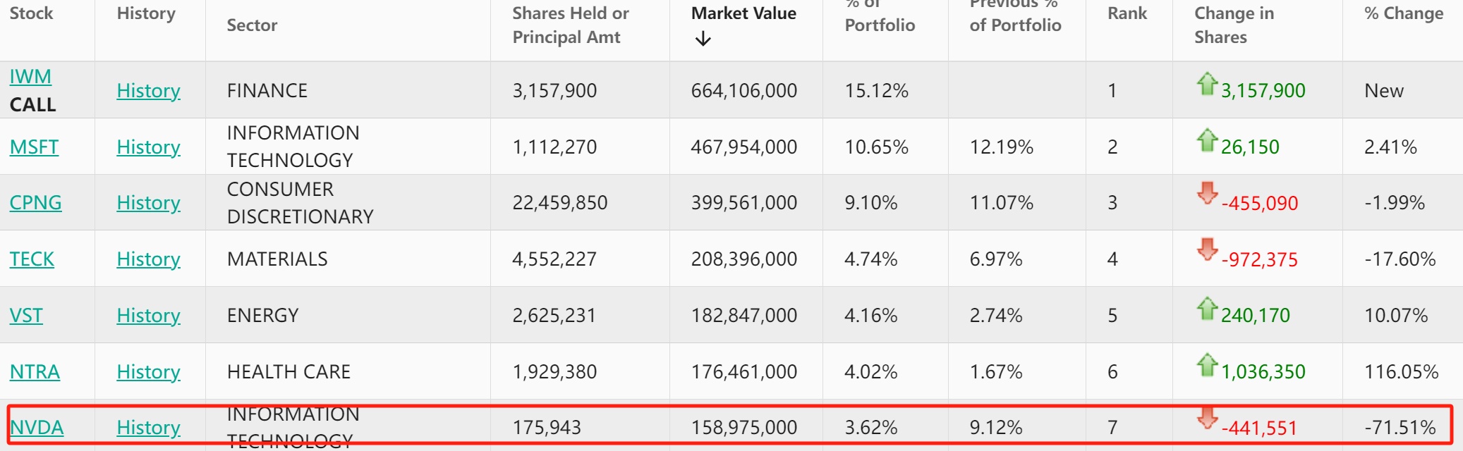 据监管文件显示,德鲁肯米勒的杜肯家族办公室(Duquesne Family Office)第一季度出售了逾44.1万股英伟达(NVDA.US)股票,使其在这家芯片制造商的持股价值降到约1.59亿美元。泰珀的Appaloosa减持了亚马逊(AMZN.US)、微软(MSFT.US)和Meta(META.US)的股份,不过这三家公司仍是其最大的投资组合。