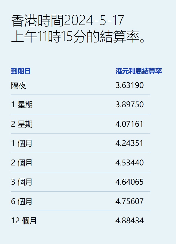 智通财经APP获悉,5月17日,港元拆息全线上扬,其中,两周拆息升近15基点至4.07161%,升穿4%。
