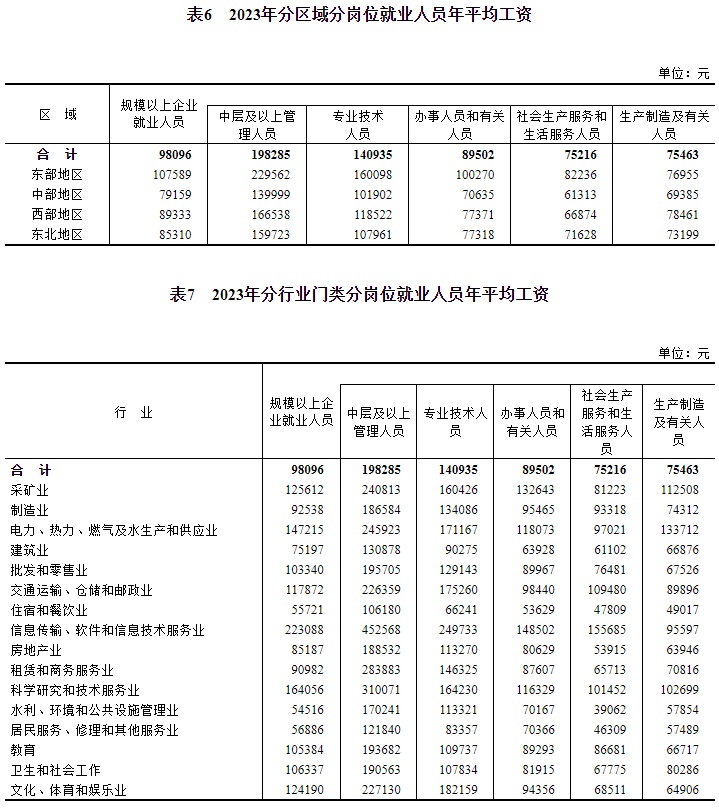 2023年,全国城镇非私营单位和私营单位就业人员年平均工资分别为120698元和68340元;规模以上企业就业人员年平均工资为98096元,其中中层及以上管理人员198285元,专业技术人员140935元,办事人员和有关人员89502元,社会生产服务和生活服务人员75216元,生产制造及有关人员75463元。