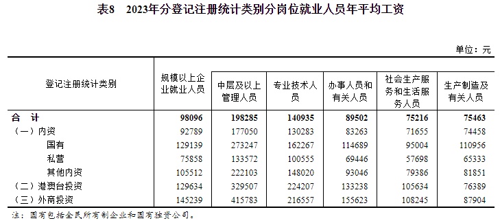 2023年,规模以上企业就业人员年平均工资为98096元,比上年增加5604元,名义增长6.1%,扣除价格因素实际增长5.8%。其中,中层及以上管理人员198285元,增长4.9%;专业技术人员140935元,增长5.8%;办事人员和有关人员89502元,增长4.2%;社会生产服务和生活服务人员75216元,增长7.1%;生产制造及有关人员75463元,增长6.1%。