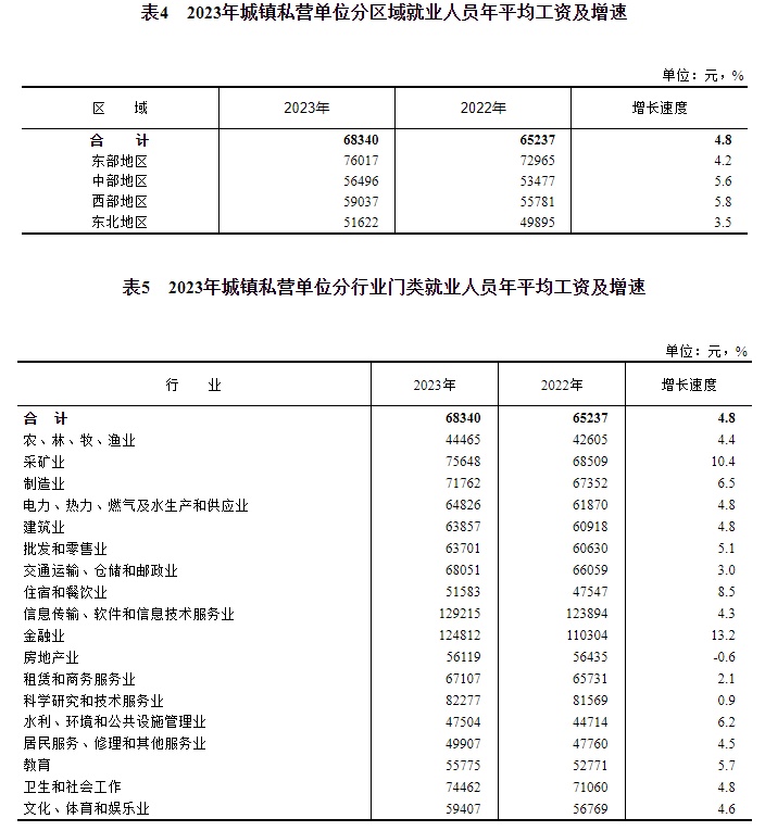 2023年,全国城镇私营单位就业人员年平均工资为68340元,比上年增加3103元,名义增长4.8%,扣除价格因素实际增长4.5%。