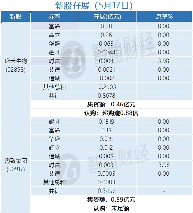 智通财经APP获悉,盛禾生物(02898)、趣致集团(00917)正在招股中。截至5月17日,辉立、富途等券商合计分别为盛禾生物借出孖展