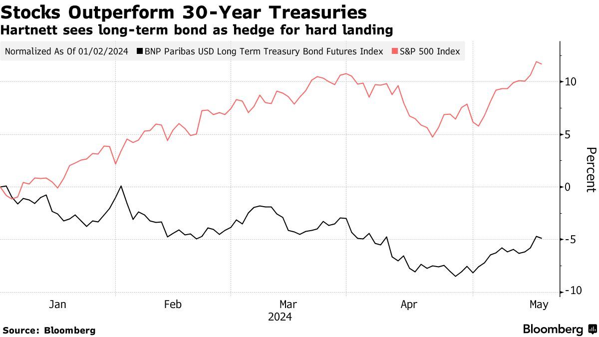 Hartnett表示,随着宏观经济形势走弱,长期债券将在2024年晚些时候迎来反弹。该策略师领导的一个团队在一份报告中表示,市场仓位、货币政策的下一步行动、以及一些经济信号减弱对企业盈利构成的风险,为下半年“除债券外的一切交易”出现逆转奠定了基础。